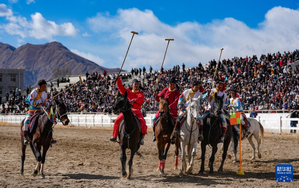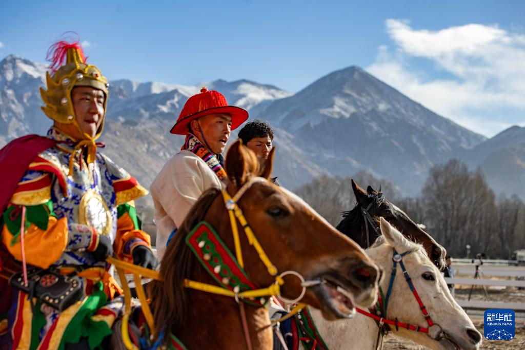 3月2日,馬術(shù)隊(duì)員在重現(xiàn)馬球比賽場(chǎng)景。新華社記者 晉美多吉 攝
