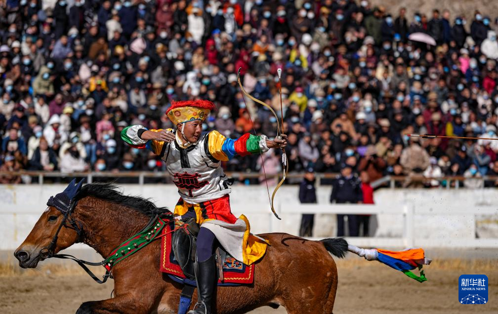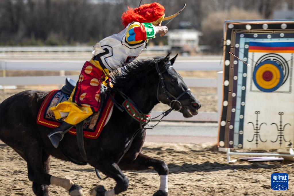 3月2日,馬術(shù)隊(duì)員在表演傳統(tǒng)馬術(shù)項(xiàng)目馬上射箭。新華社記者 晉美多吉 攝