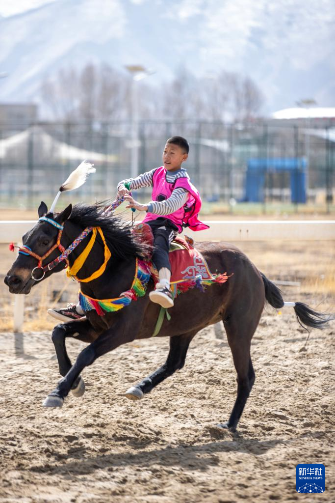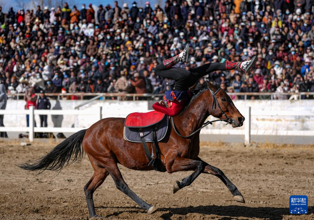 3月2日,馬術(shù)隊(duì)員在表演傳統(tǒng)馬術(shù)項(xiàng)目。新華社記者 晉美多吉 攝