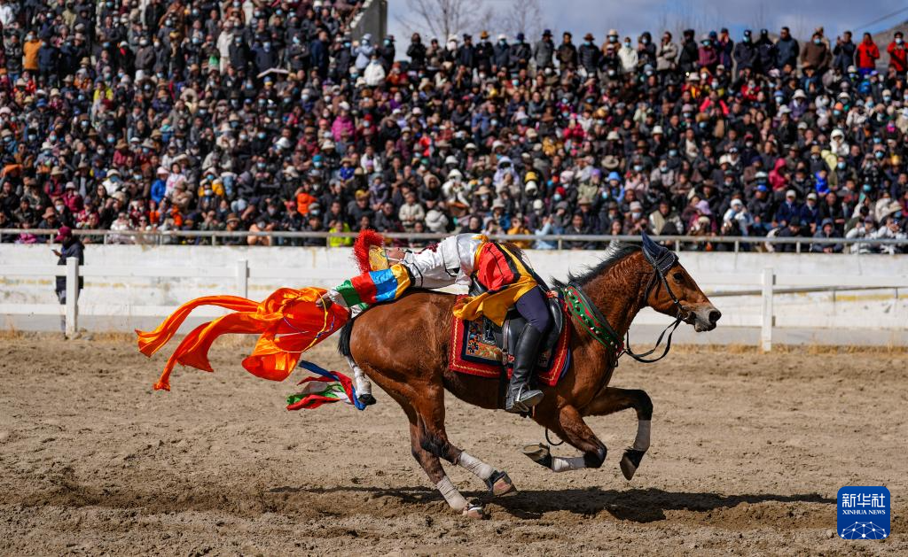 3月2日,馬術(shù)隊(duì)員在表演傳統(tǒng)馬術(shù)項(xiàng)目撿哈達(dá)。新華社記者 晉美多吉 攝