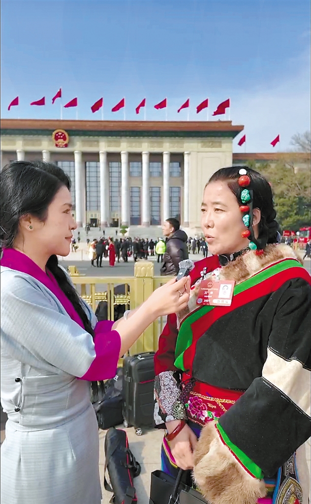 黨的光輝照邊疆,邊疆人民心向黨?!?024年,我們縣迎來兩件大喜事,一是縣人民醫(yī)院新院址投入使用,院區(qū)整潔、漂亮,醫(yī)院技術裝備也更新升級,進一步實現了家門口‘能看病’到‘看好病’的飛躍;二是縣第二中學竣工,現代化的新校舍進一步實現了‘辦好牧民家門口的優(yōu)質學校的目標’。這次全國兩會上,我會把這些好消息分享給其他代表委員,讓他們知道在黨的堅強領導下,西藏確確實實富起來、好起來了?!逼涞录拥亟榻B說。