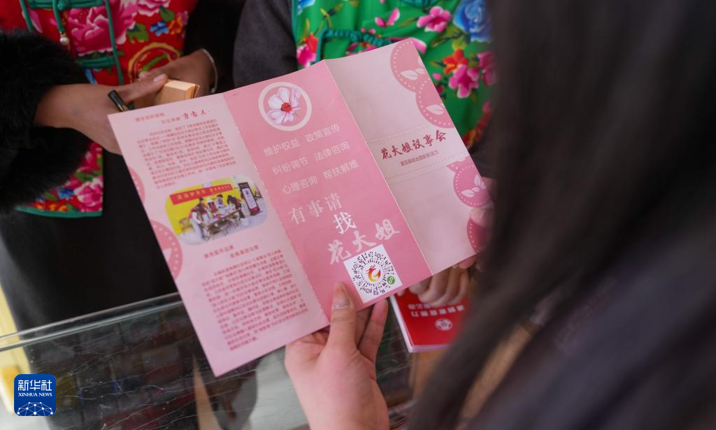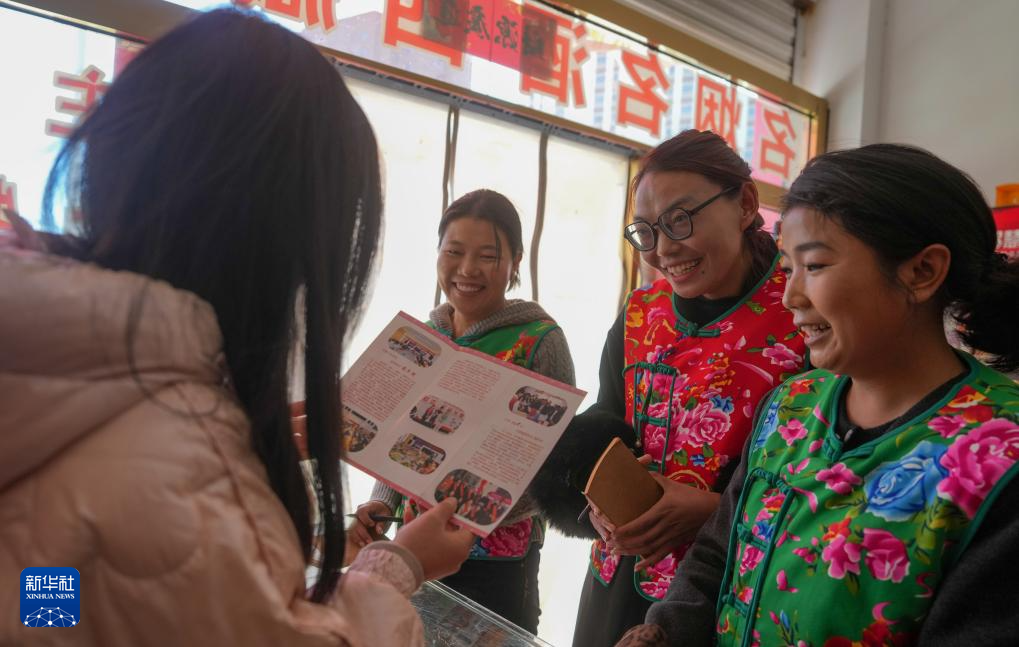 “花大姐”向轄區(qū)商戶發(fā)放議事會宣傳材料(3月6日攝)。新華社記者 晉美多吉 攝