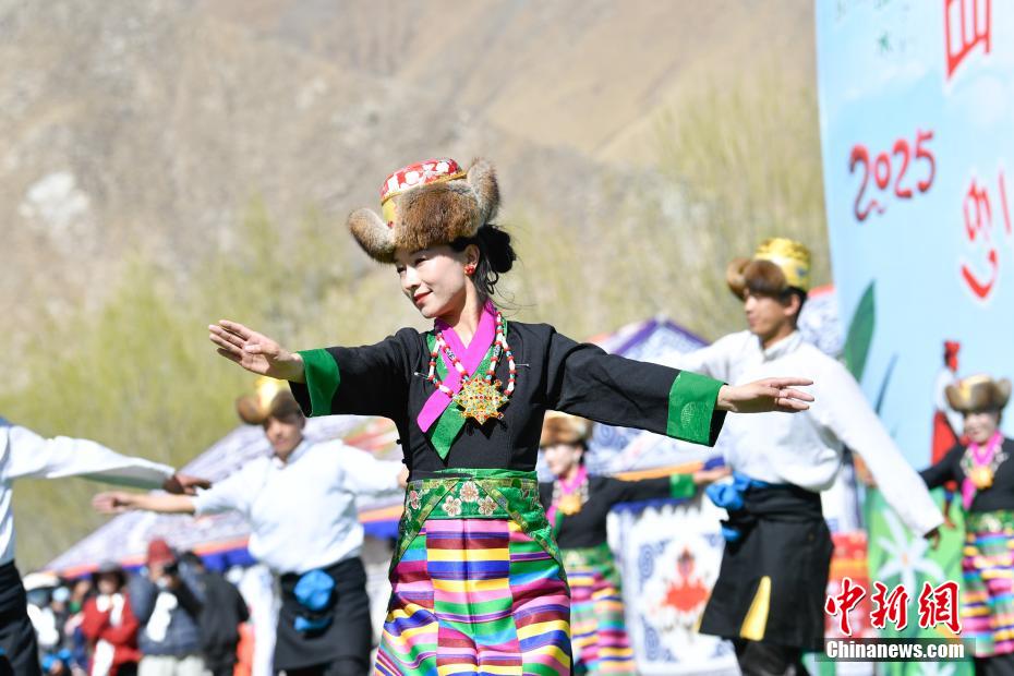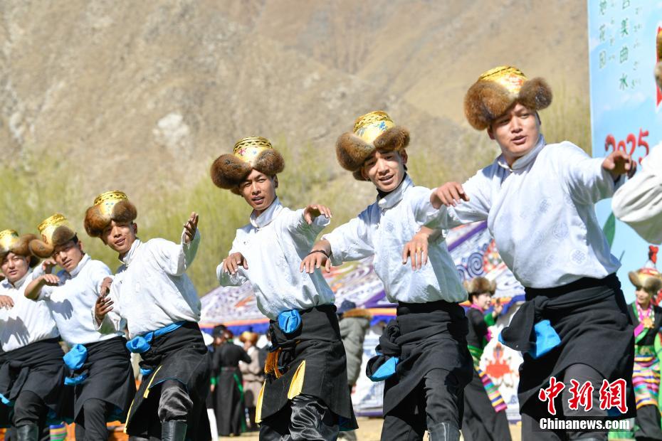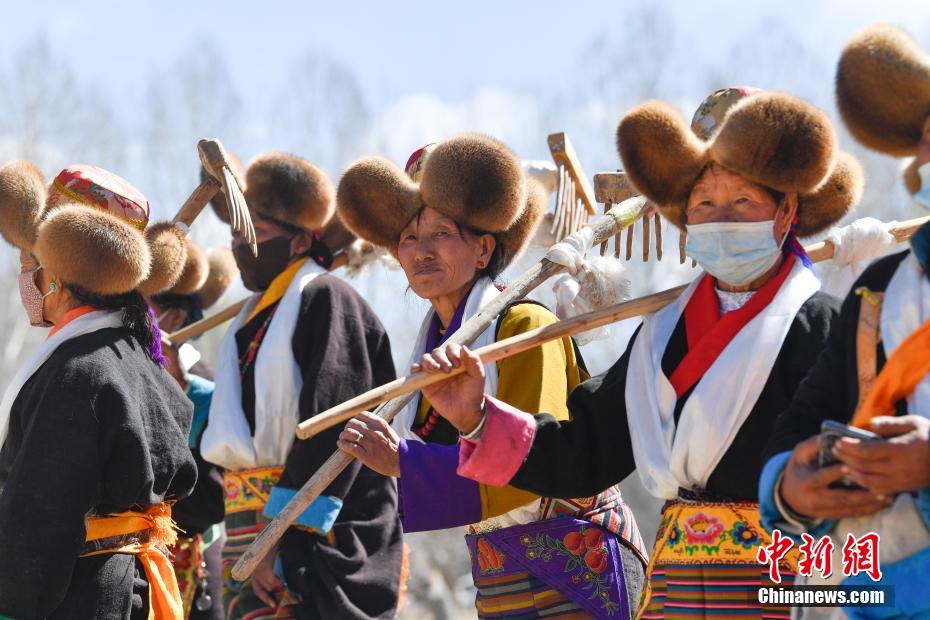 3月16日,西藏拉薩迎來(lái)一年一度的傳統(tǒng)春耕儀式。當(dāng)日,拉薩市曲水縣色達(dá)村村民身著節(jié)日盛裝,相聚在田間,載歌載舞,共同迎接春耕第一犁。家家戶(hù)戶(hù)端著自家的“切瑪”(象征五谷豐登)帶著青稞酒、酥油茶等物品聚在田間,互敬青稞酒,開(kāi)始撒種,祈求全年風(fēng)調(diào)雨順、五谷豐登。圖為曲水縣色達(dá)村春耕儀式現(xiàn)場(chǎng),當(dāng)?shù)孛癖姳硌輫?guó)家級(jí)非物質(zhì)文化遺產(chǎn)《吉祥仲孜》。中新社記者 貢嘎來(lái)松 攝