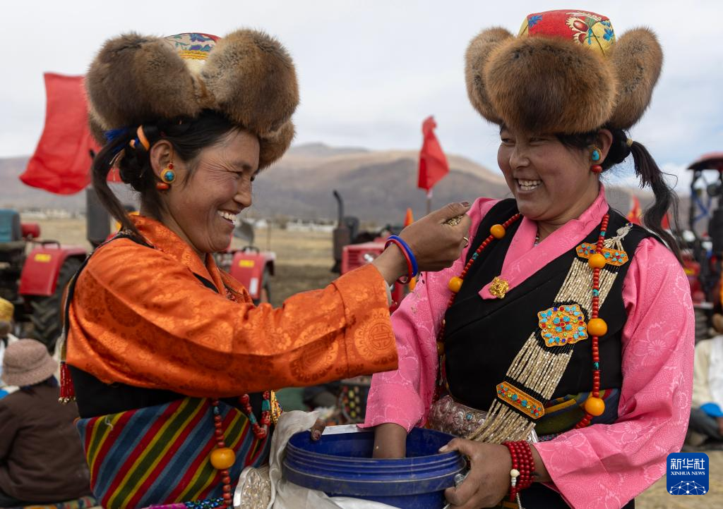 拖拉機作業(yè)結(jié)束后,大家圍坐在農(nóng)田之上,喝著青稞酒,跳著“拉孜堆諧”(拉孜地區(qū)特有的舞蹈),祈愿風調(diào)雨順,五谷豐登。