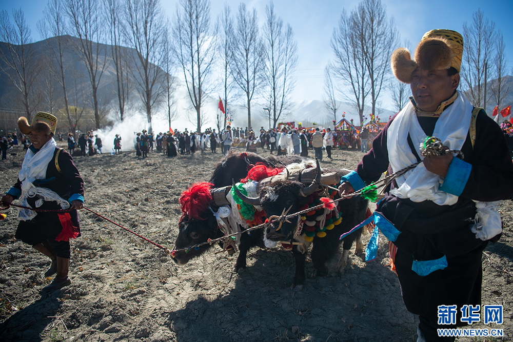 3月16日,在西藏山南市乃東區(qū)門中崗社區(qū)春耕典禮上,當地群眾按照傳統(tǒng)的“二牛抬杠”耕作方式翻土犁地。新華網 旦增努布 攝