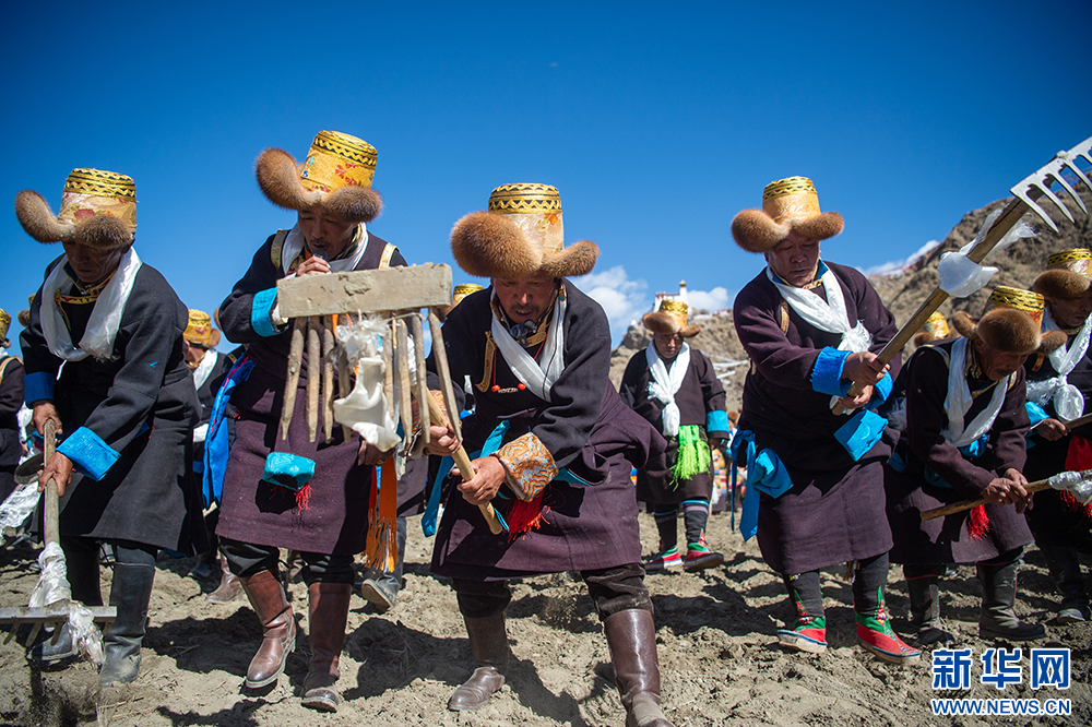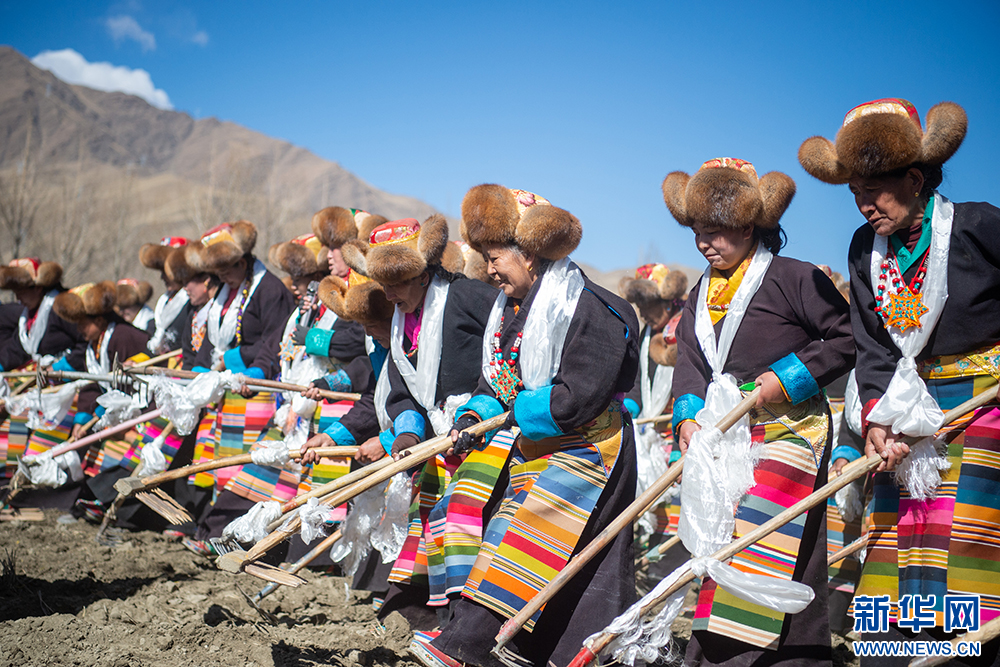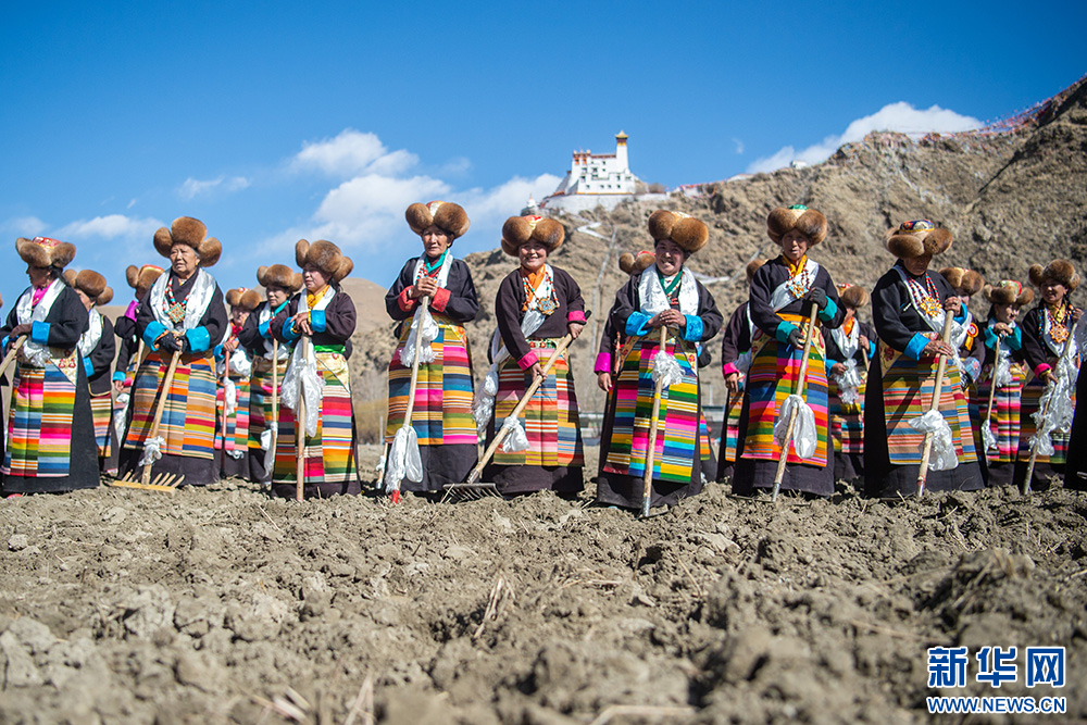 16日,西藏山南市乃東區(qū)門中崗社區(qū)的群眾按照傳統(tǒng)儀式,身著盛裝,手捧青稞酒,在雍布拉康宮殿腳下的西藏“第一塊農田”舉行春耕儀式,播撒今春第一粒種子。
