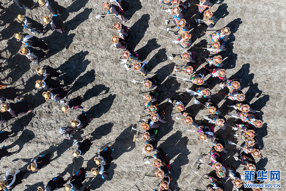 圖為西藏山南市乃東區(qū)門中崗社區(qū)春耕儀式現場(3月16日攝,無人機照片)。新華網 旦增努布 攝