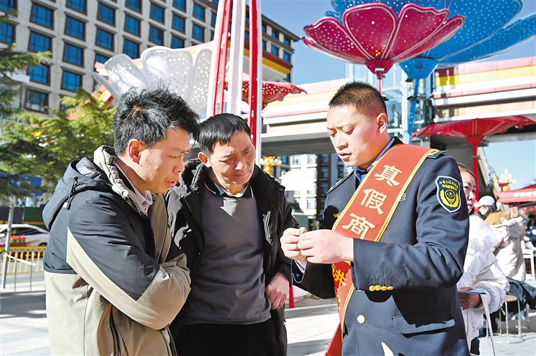圖為桑珠孜區(qū)市場(chǎng)監(jiān)管局投訴舉報(bào)中心負(fù)責(zé)人李良友(右)向市民講解商品真假辨別方法。 記者 扎西頓珠 攝