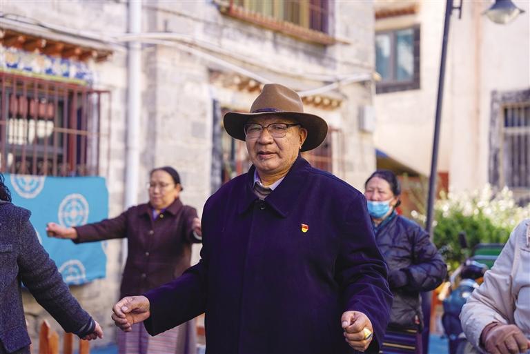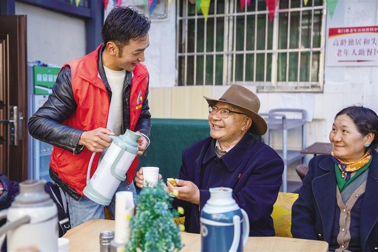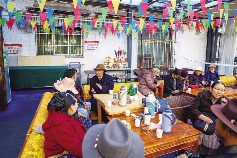 “波啦,您來啦,快坐下來喝點(diǎn)熱茶?!薄澳玻龝?huì)午飯?jiān)谶@邊吃嗎?”近日,記者來到拉薩市城關(guān)區(qū)蕃陽社會(huì)工作者和志愿者服務(wù)協(xié)會(huì)下的策門林老年日間照料中心,剛進(jìn)大門就被一群正在鍛煉身體的老人所吸引。他們跟著老師抬手、踢腿、扭腰,動(dòng)作整齊劃一,臉上洋溢著幸福的笑容。鍛煉結(jié)束后,赤來回到助餐區(qū),邊喝甜茶邊吃“卡賽”,和老人們分享趣聞,拉著家常,現(xiàn)場(chǎng)傳來一陣陣歡聲笑語。