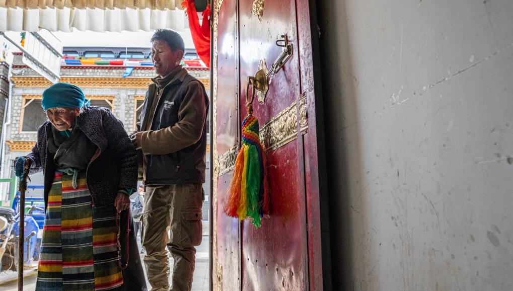 孫子照看著玉珍奶奶回屋(3月12日攝)。新華社記者 丁增尼達 攝