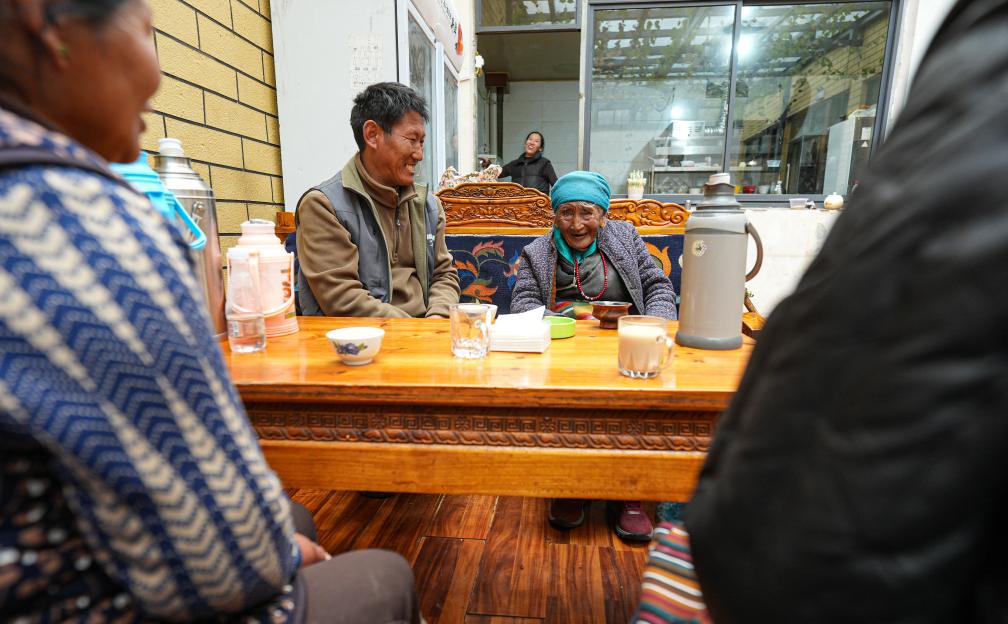 玉珍奶奶在自家的茶館里和孫子及鄰居喝茶聊天(3月12日攝)。新華社記者 晉美多吉 攝