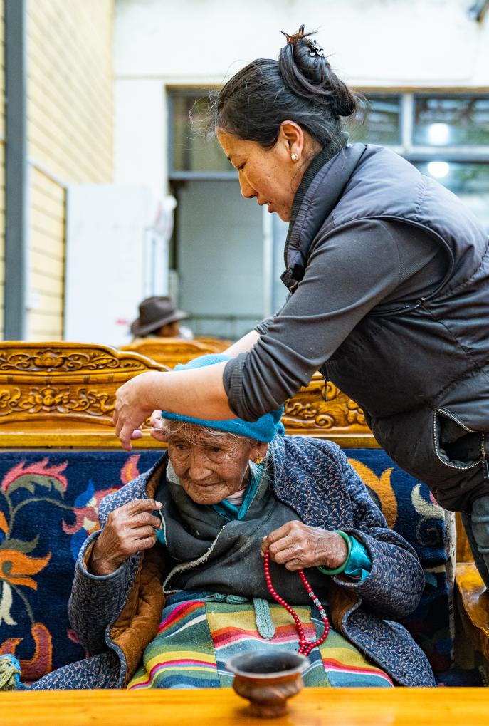 孫媳婦在幫助玉珍奶奶整理頭巾(3月12日攝)。新華社記者 丁增尼達 攝