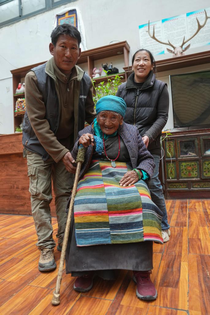 玉珍奶奶(中)和孫子、孫媳婦合影(3月12日攝)。新華社記者 晉美多吉 攝