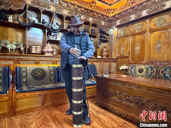 圖為米瑪頓珠在展示傳統(tǒng)的酥油桶。貢桑旺姆 攝