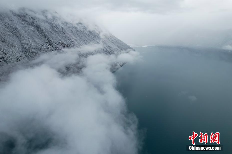 巴松錯(cuò)位于西藏林芝工布江達(dá)縣境內(nèi),地處巴河上游的高山峽谷中,是西藏首個(gè)自然風(fēng)景類國家5A級(jí)旅游景區(qū)。4月5日,巴松錯(cuò)迎來一場春雪,雪后四周原始森林猶如蒙上潔白面紗,湖面宛如一面藍(lán)寶石鑲嵌其中,風(fēng)光如畫。圖為4月5日,雪后巴松錯(cuò)四周云霧繚繞,猶如仙境。(無人機(jī)畫面)中新社記者 江飛波 攝