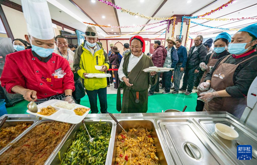4月25日,在那曲市色尼區(qū)老年人日間照料中心,老人們在排隊(duì)打飯。新華社記者 丁增尼達(dá) 攝
