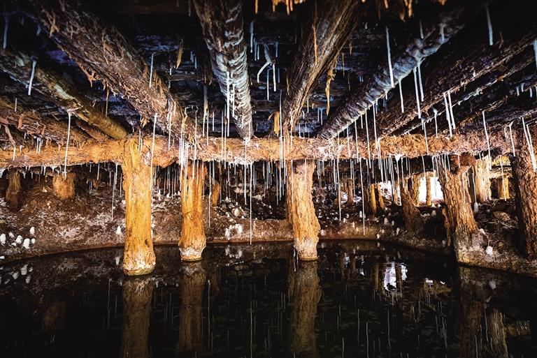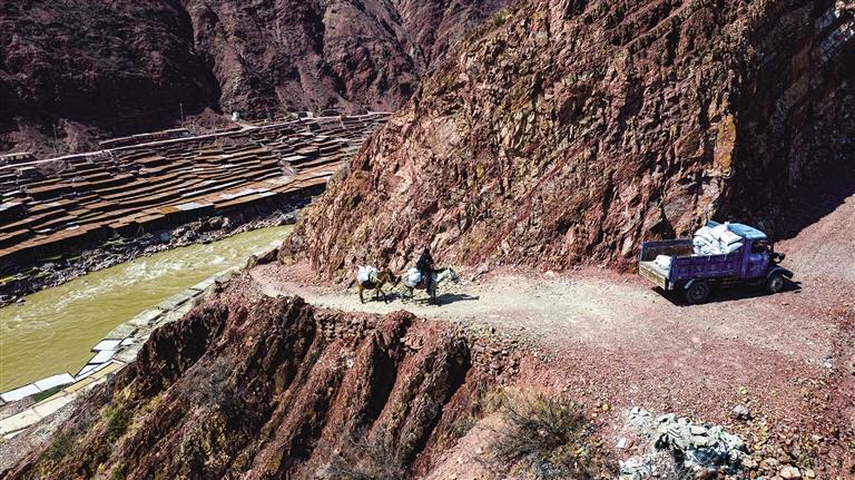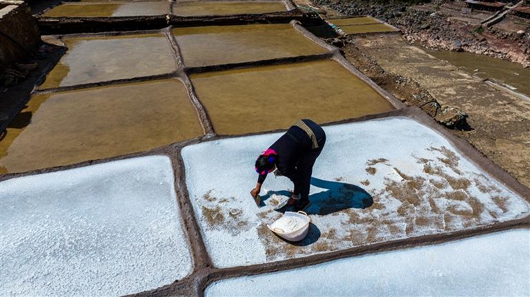 鹽田上,60歲的乃柯正和丈夫一起用木拍夯實(shí)鹽田?!艾F(xiàn)在用泵抽水輕松多了,但拍鹽田的手藝不能丟。”老人的話語(yǔ)中,既有對(duì)科技的接納,也有對(duì)傳統(tǒng)的堅(jiān)守。鹽田下方,鹽晶垂落成簾,在山風(fēng)拂動(dòng)下閃爍微光,仿佛在訴說(shuō)著千年文明的厚重。