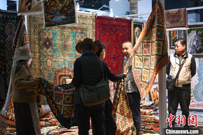 圖為拉薩進(jìn)口商品展覽會(huì)現(xiàn)場(chǎng),伊朗商人(左)向顧客介紹、推銷毛毯。中新社記者 貢嘎來松 攝