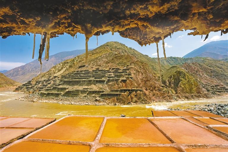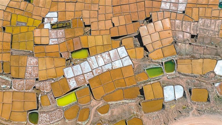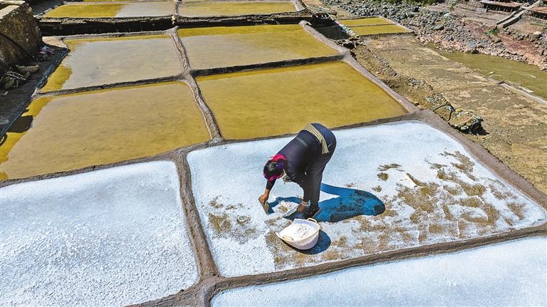 鹽田里,60歲的乃柯正和丈夫一起用木拍夯實(shí)鹽田。“現(xiàn)在用泵抽水輕松多了,但拍鹽田的手藝不能丟?!崩先说脑捳Z(yǔ)中,既有對(duì)科技的接納,也有對(duì)傳統(tǒng)的堅(jiān)守。鹽田下方,鹽晶垂落成簾,在山風(fēng)拂動(dòng)下閃爍微光,仿佛在訴說(shuō)著什么。一塊塊鹽田如同一面面鏡子,既映照出千年文明的厚重,也折射著鄉(xiāng)村振興的希望。當(dāng)鹽民們輕掃鹽田,他們掃的不僅是晶瑩的鹽,更是一份在傳承與創(chuàng)新中守護(hù)的鄉(xiāng)愁。