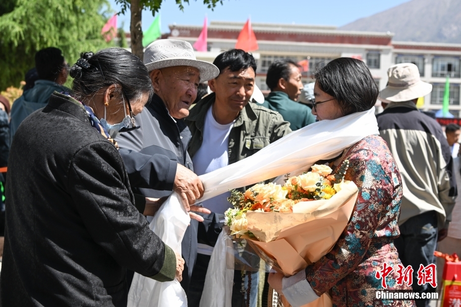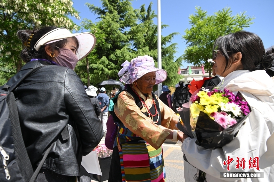 6月9日上午11時30分,西藏自治區(qū)2025年普通高考完成所有科目考試。圖為家長在拉薩市拉薩中學考點外為結束考試的孩子獻鮮花。中新社記者 李林 攝
