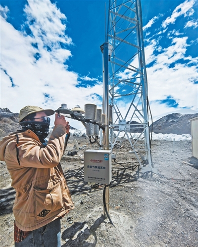 安多縣的氣象裝備保障人員在格拉丹東自動(dòng)氣象站開展維護(hù)保障工作。安多縣氣象局供圖