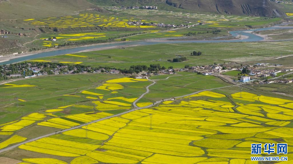 圖為7月2日拍攝的俯瞰墨竹工卡縣扎西崗鄉(xiāng)加爾多村油菜花田(無(wú)人機(jī)照片)。新華網(wǎng)發(fā) 洛克 攝