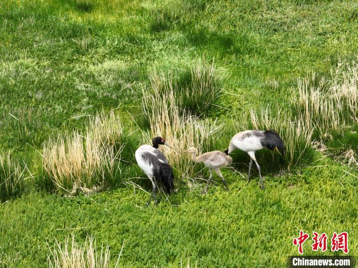 7月10日,在海拔4700米的西藏自治區(qū)那曲市申扎縣濕地里,黑頸鶴一家在悠閑覓食。黑頸鶴是中國國家一級重點(diǎn)保護(hù)野生動物,屬高原特有鶴類,主要棲息于海拔2500米至5000米的高原沼澤地、湖泊及河灘等濕地環(huán)境。每年四月起,成對的黑頸鶴陸續(xù)飛抵西藏自治區(qū)那曲市申扎縣,在此繁育后代。近年來,申扎縣持續(xù)加強(qiáng)生態(tài)修復(fù),濕地面積擴(kuò)大、水質(zhì)改善,為黑頸鶴等珍稀物種提供了理想家園。中新社發(fā) 毛建軍 攝