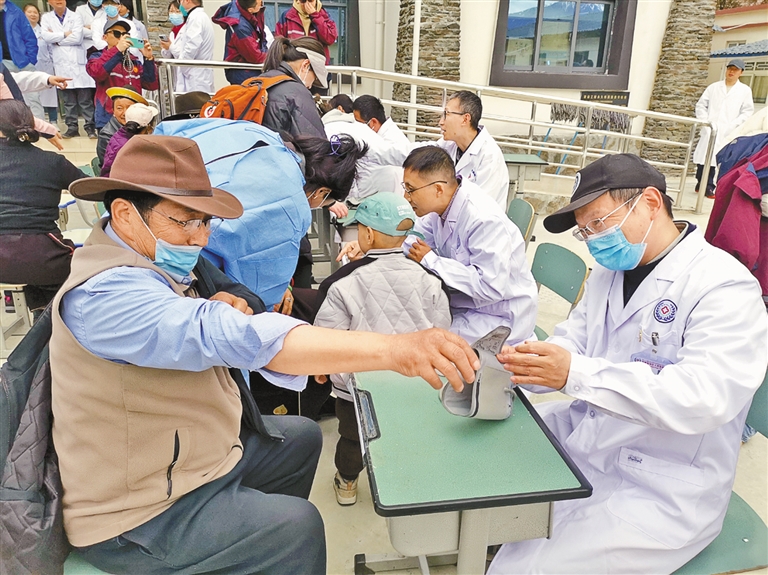 第八批阜外醫(yī)院援藏專家胡海波為工布江達(dá)縣巴河鎮(zhèn)群眾義診(資料圖片)。