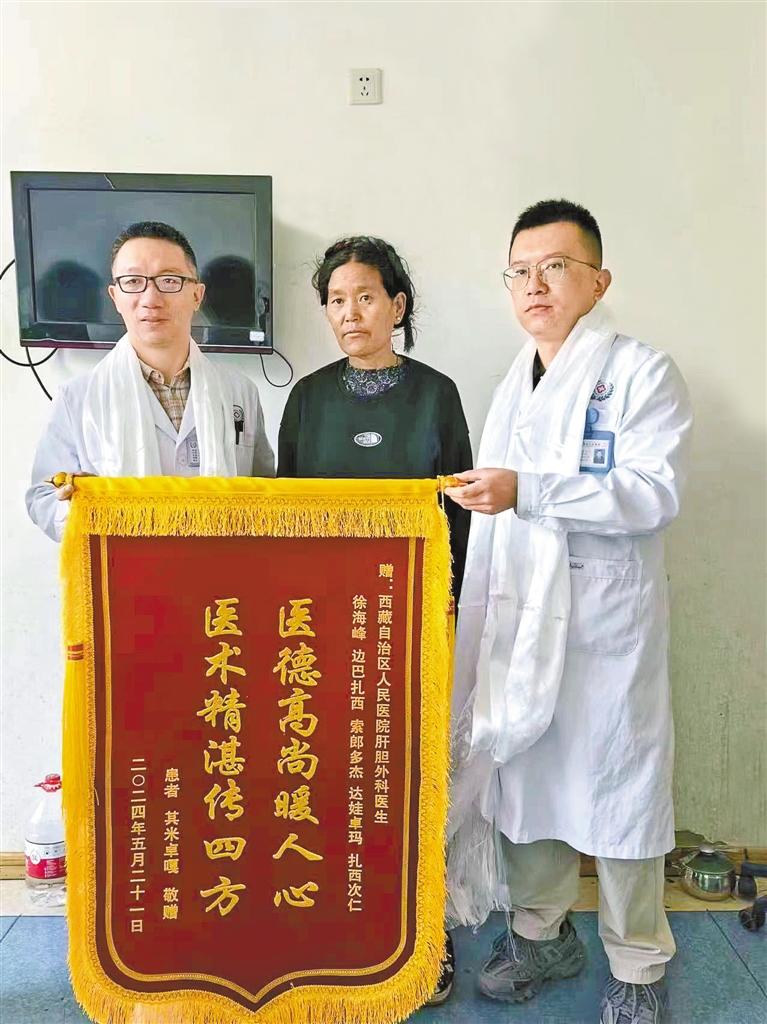 第九、十批北京協(xié)和醫(yī)院援藏醫(yī)生徐海峰(左)接受出院患者贈(zèng)送的錦旗(資料圖片)。