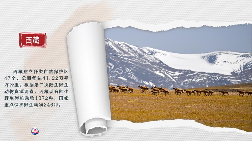 西藏建立各類自然保護(hù)區(qū)47個(gè),總面積達(dá)41.22萬(wàn)平方公里。根據(jù)第二次陸生野生動(dòng)物資源調(diào)查,西藏現(xiàn)有陸生野生脊椎動(dòng)物1072種,國(guó)家重點(diǎn)保護(hù)野生動(dòng)物246種。