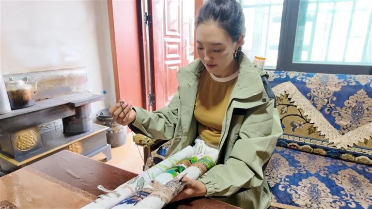 卓瑪措姆在繡十字繡。 圖由洛桑旺久提供