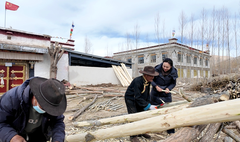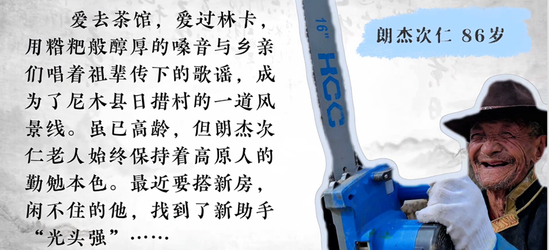 雖已86歲高齡,但朗杰次仁老人始終保持著高原人的勤勉本色。最近老人要搭建新房,我們來(lái)時(shí),他正和新助手“光頭強(qiáng)”(電鋸)一起在小院里忙活。