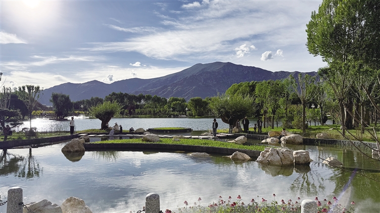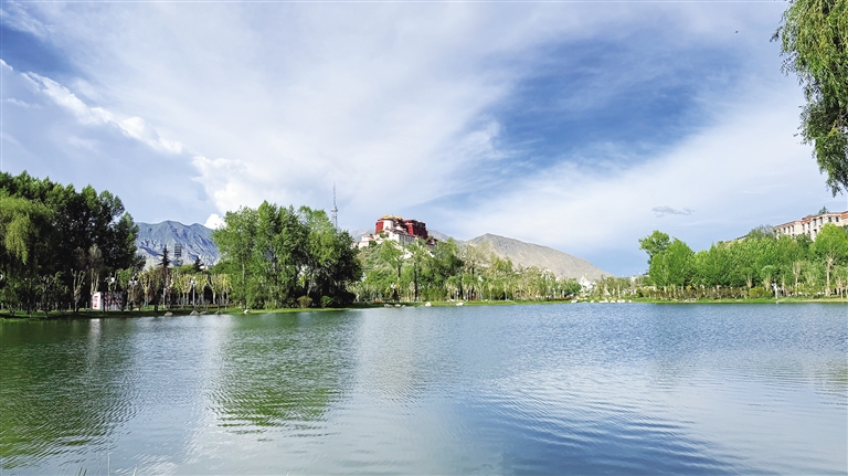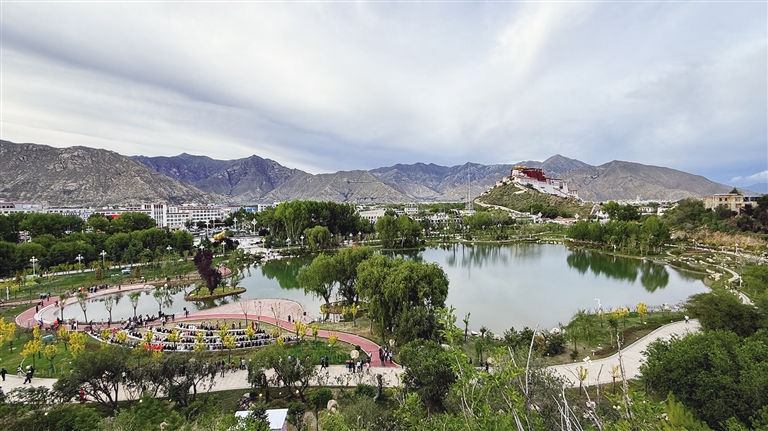 拉薩團(tuán)結(jié)公園坐落于布達(dá)拉宮西麓、藥王山腳下。昔日,這里房屋高低錯(cuò)雜、線纜交錯(cuò)密布、市場(chǎng)喧鬧擁擠、環(huán)境喧囂擾攘,不僅影響城市形象和生態(tài)環(huán)境,還影響出行游玩體驗(yàn)。如今,湖水如碧綢般清澈,岸邊綠樹成蔭,各類花卉競(jìng)相綻放,昔日雜亂之地已蛻變?yōu)轸浯涿髦?,人文古跡與自然景致相映成趣,共同繪就出“百澤繞城·水城相依”的生態(tài)文明畫卷。