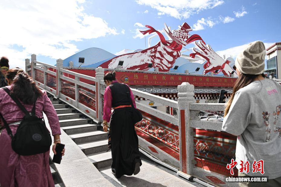 拉薩正以最美姿態(tài),迎接這一重要時刻。圖為裝扮一新的人行天橋。中新社記者 貢嘎來松 攝