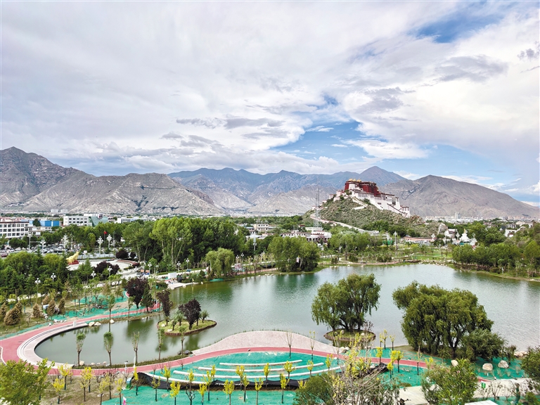 站在藥王山觀景臺眺望,重獲新生的水系如綠色飄帶擁抱著布達(dá)拉宮。