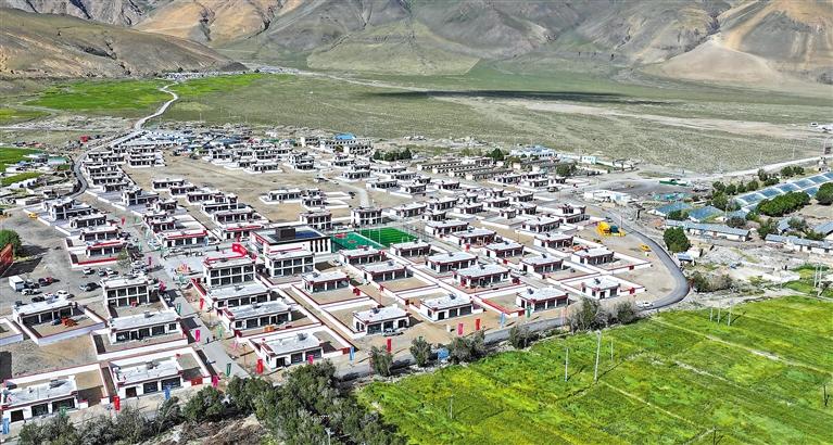 高原夏日燦爛的陽(yáng)光灑落在森嘎村,給一排排新落成的房屋披上了金色的光輝,繪制新彩的門(mén)窗閃耀奪目的光彩,一面面鮮艷的五星紅旗在屋頂上獵獵招展……