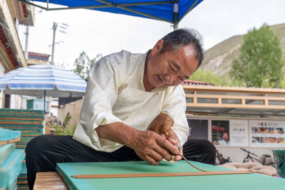 8月6日,一名雕刻師在工作中。西藏傳統(tǒng)雕刻修復(fù)技藝入選西藏自治區(qū)級非物質(zhì)文化遺產(chǎn)代表性項目名錄。