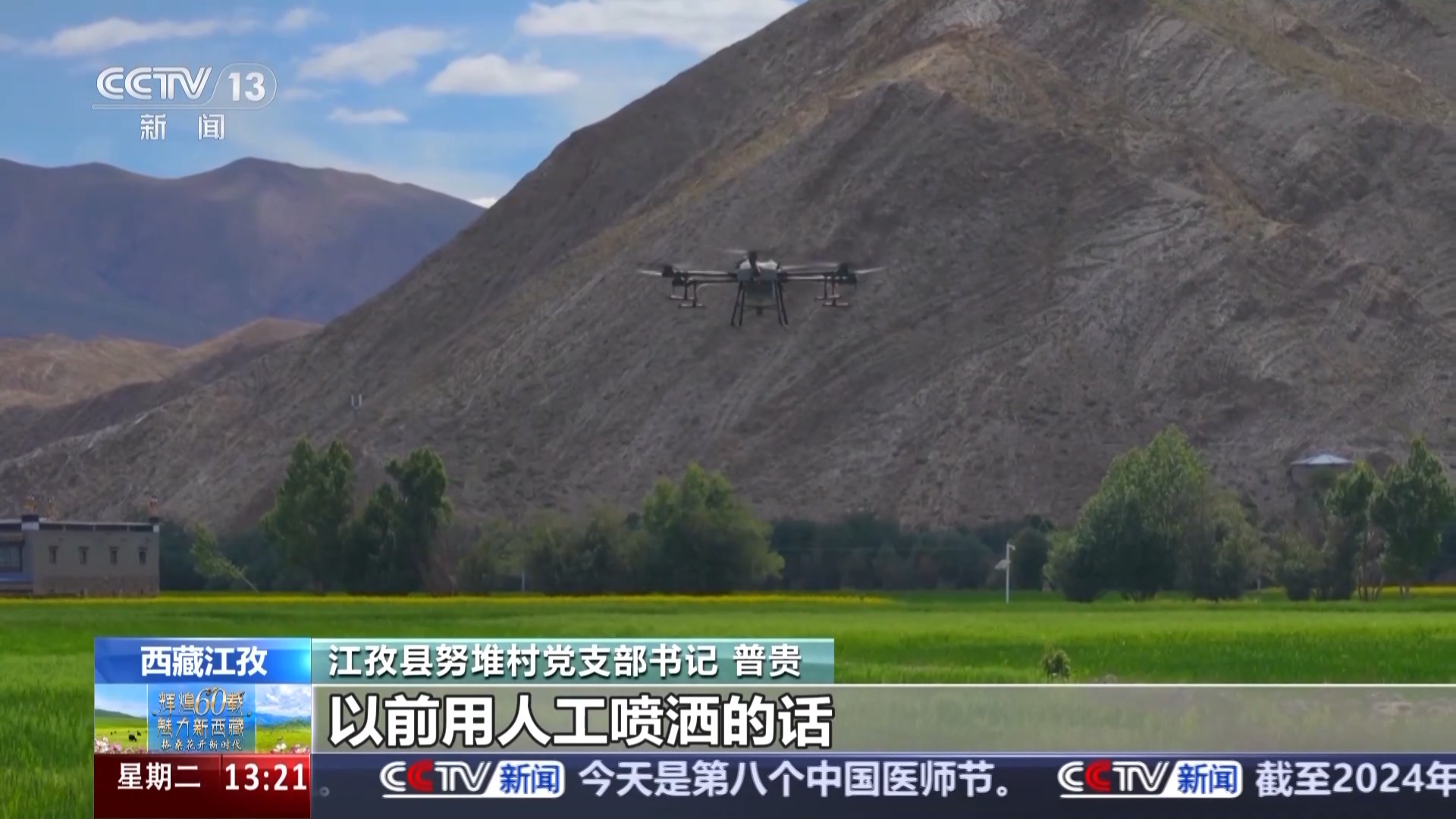 西藏日喀則市江孜縣努堆村黨支部書記 普貴:這幾天我們正在給青稞噴灑葉面肥,以前人工噴灑,一畝地需要半小時左右?,F(xiàn)在用無人機,半小時能噴灑30多畝地,我們村的2500多畝地大概需要兩天就能完成。