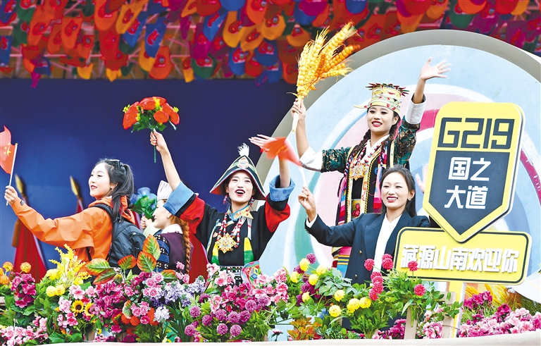 “藏源山南”彩車(chē)上的演員通過(guò)布達(dá)拉宮廣場(chǎng)時(shí)向人群揮手。