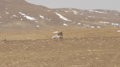 下車望去,不遠處的山坡上,一只孤狼正虎視眈眈,腳下倒著一只母羊,生死未卜。也許是已經(jīng)發(fā)現(xiàn)了我們,狼很快就消失在了山的那一邊。