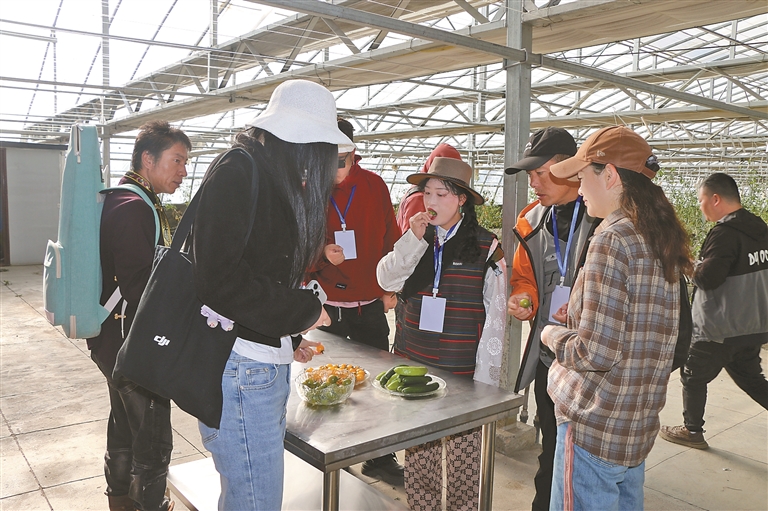 圖為網(wǎng)絡(luò)達(dá)人在瓊結(jié)縣菜籃子基地參觀拍攝。