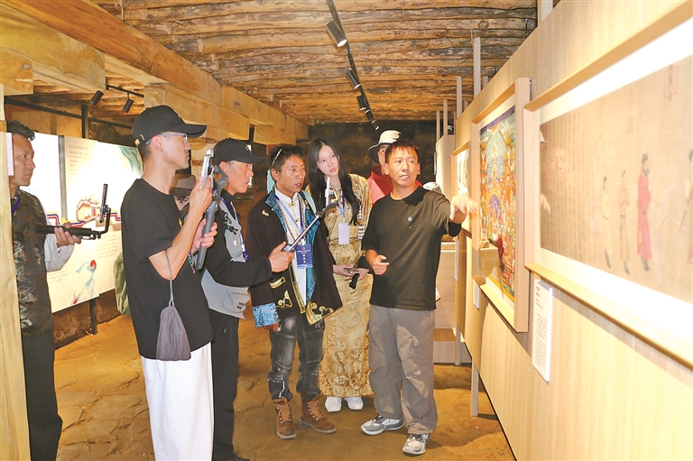 圖為網(wǎng)絡(luò)達(dá)人參觀拍攝瓊結(jié)縣歷史美女達(dá)娃卓瑪身著的傳統(tǒng)服飾。