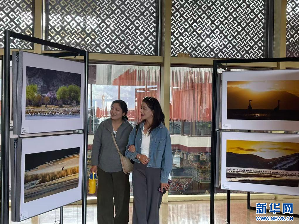 拉薩市民群宗(右一)和朋友在觀看“天上西藏·鶴鶴有鳴”——黑頸鶴主題攝影展作品。新華社記者 蔣夢(mèng)辰 攝