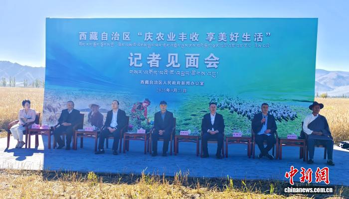 西藏自治區(qū)“慶農(nóng)業(yè)豐收享美好生活”記者見(jiàn)面會(huì)23日在拉薩市林周縣一片金黃的青稞田間舉行。西藏自治區(qū)農(nóng)業(yè)農(nóng)村廳二級(jí)巡視員米瑪次仁坐在發(fā)言席上,身后是山脈環(huán)繞的金色青稞田,遠(yuǎn)處聯(lián)合收割機(jī)轟鳴作業(yè)。他以詳實(shí)數(shù)據(jù)和親身經(jīng)歷,講述了西藏農(nóng)牧業(yè)60年的滄桑巨變。