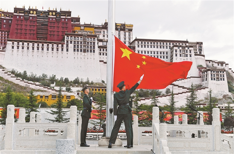國(guó)旗飄揚(yáng),激發(fā)愛(ài)國(guó)力量;國(guó)歌雄壯,奏響奮進(jìn)樂(lè)章。大家一致表示,要更加緊密地團(tuán)結(jié)在以習(xí)近平同志為核心的黨中央周?chē)?,全面貫徹?xí)近平總書(shū)記關(guān)于西藏工作的重要指示和新時(shí)代黨的治藏方略,深入貫徹落實(shí)習(xí)近平總書(shū)記視察西藏時(shí)的重要講話(huà)精神,聚焦“四件大事”聚力“四個(gè)創(chuàng)建”,銳意進(jìn)取、埋頭苦干,把滿(mǎn)腔的愛(ài)國(guó)熱情轉(zhuǎn)化為干事創(chuàng)業(yè)的不竭動(dòng)力,以更加務(wù)實(shí)的作風(fēng)、更加昂揚(yáng)的斗志積極投身工作,為共建中華民族共同體、書(shū)寫(xiě)美麗西藏新篇章貢獻(xiàn)力量。