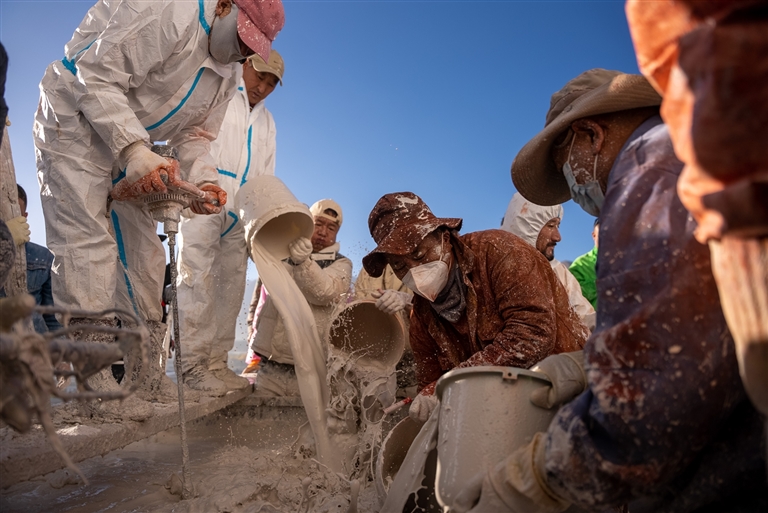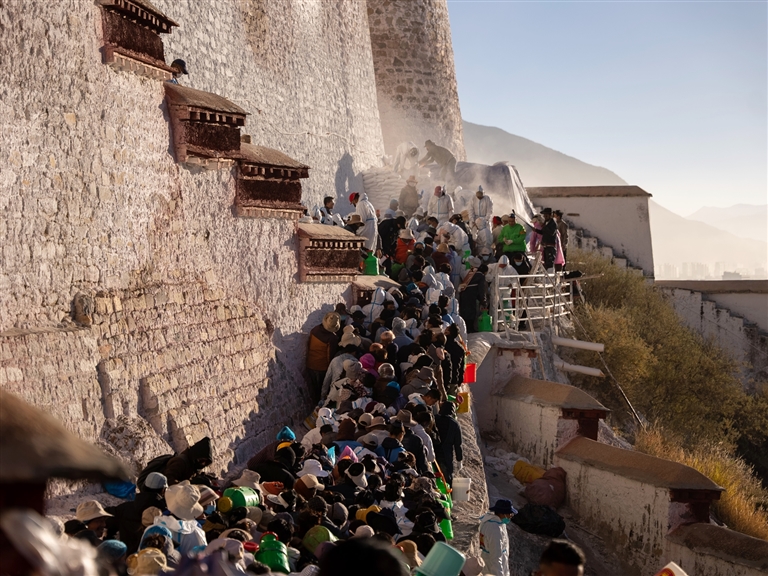 宮墻下,人們排隊(duì)領(lǐng)取防護(hù)服,而后疾步前往涂料攪拌點(diǎn),生怕去遲了一步,這就是一年一度的布達(dá)拉宮粉刷季,現(xiàn)場(chǎng)鮮活又熱鬧。