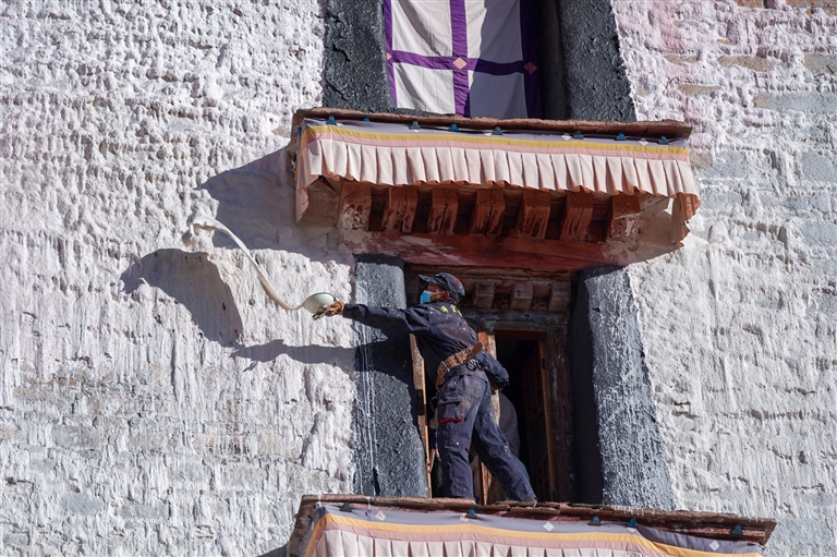 不遠(yuǎn)處,安全繩在布達(dá)拉宮白色的墻壁上勾勒出利落的線條。工匠拿著長(zhǎng)刷柄和噴槍,正仔細(xì)地粉刷著墻壁的各個(gè)角落。陽(yáng)光刺眼,卻絲毫不影響他們手中利落的動(dòng)作。