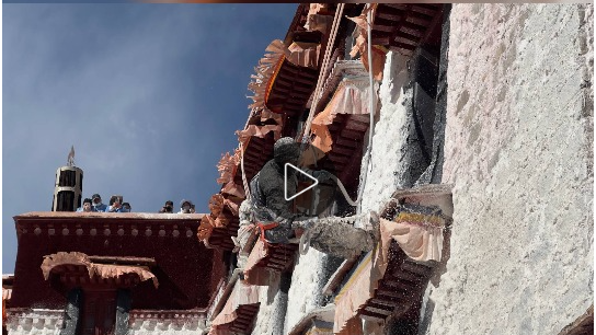 布達(dá)拉宮迎來了一年一度的“煥新”計(jì)劃,來自布達(dá)拉宮管理處的專業(yè)人員,與當(dāng)?shù)孛癖?、熱心志愿者們共同投入到這場(chǎng)“年度美容”工程中,為這座擁有千年歷史的古老宮殿披上潔白莊嚴(yán)的“新衣”。參與涂墻的民眾,身上、頭發(fā)上都沾滿了白色的涂料,仿佛落了一層細(xì)雪。同時(shí),一桶桶涂料被有序地傳送并潑灑在墻面上,布達(dá)拉宮這座屹立千年的宮殿在陽光下也愈發(fā)明亮。除此之外,大昭寺、色拉寺等大大小小的寺廟及民居的房屋也會(huì)開始粉刷,這一工作將在藏歷九月二十二日之前完成。