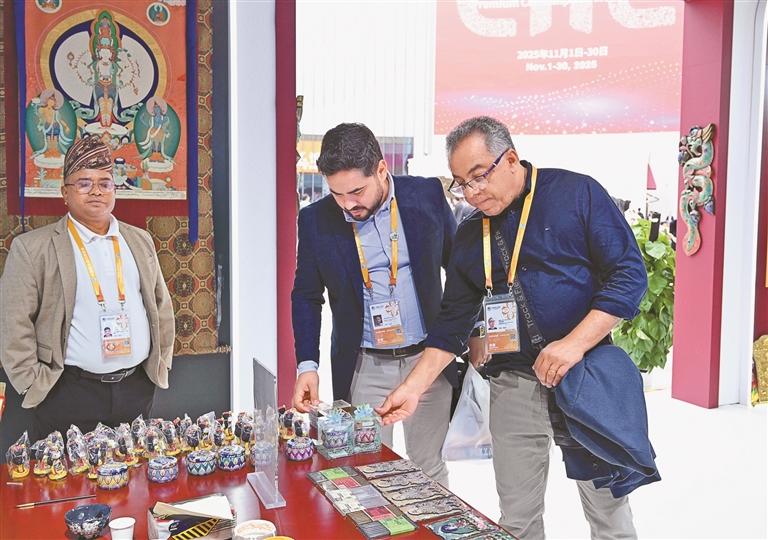 圖為第八屆中國(guó)國(guó)際進(jìn)口博覽會(huì)西藏館內(nèi)的客人在選購商品。記者 王敏 索朗瓊珠 嘎松卓瑪 攝影報(bào)道