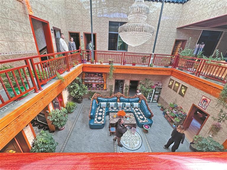 走進(jìn)次仁措姆家院子里,她正在自家果園采摘剛成熟的石榴,房前的小院里整齊擺放著各種盆栽?!耙郧胺壳拔莺箅s物亂堆,經(jīng)過整治,空出的地方種上了蔬果,現(xiàn)在家家戶戶都有小果園,多虧了村里的整治行動?!贝稳蚀肽奉I(lǐng)著我們到客廳,指著墻上的“美麗庭院”流動紅旗笑著說:“這面旗是上個月評上的,現(xiàn)在村里都比著搞衛(wèi)生,誰也不想落后。”
